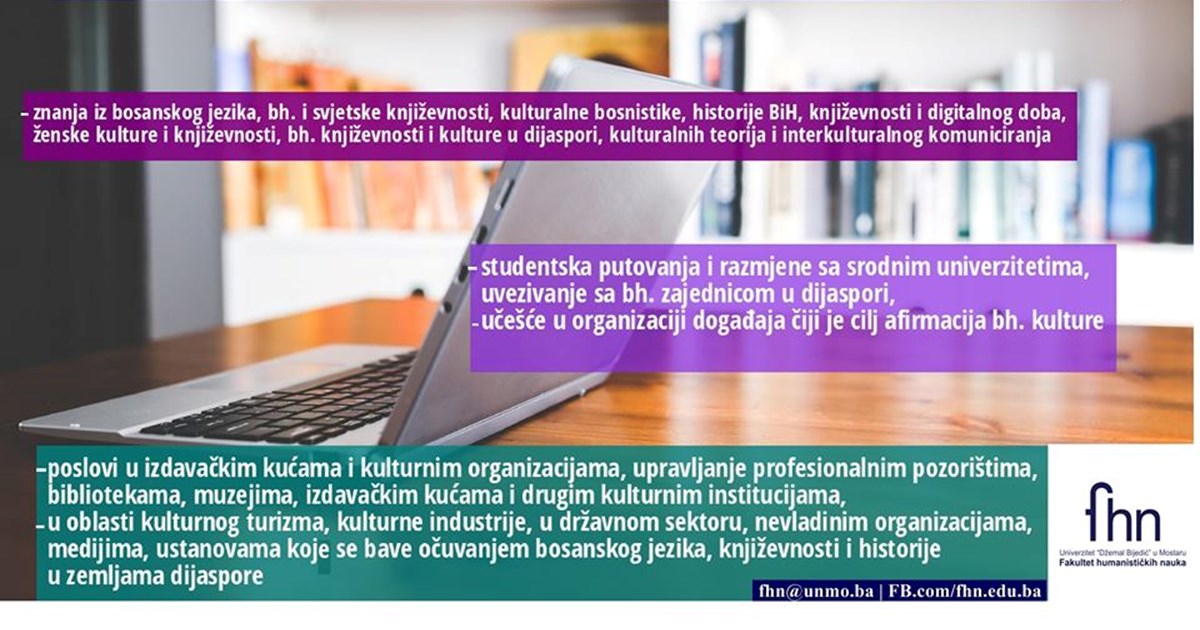The four-year study program in the field of Cultural Studies and Bosnian Studies at the Faculty of Humanities, University "Džemal Bijedić" in Mostar was created according to the Bologna principles of study, and 2020/2021. enrolls the first generation of students in the first cycle (undergraduate) study. This two-subject study program is designed in the wake of contemporary tren ...